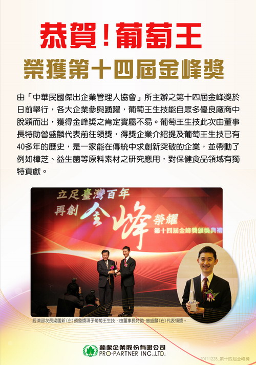 在台湾2千多万人的市场,却能创造出排行台湾直销市场第六名年营业额新台币26.7亿元(约人民币5.3亿元)的葡众,近日来其母公司〝葡萄王〞获奖不断,才刚被颁〝绩优创新中小企业奖〞,现在又脱颖而出获得金锋奖。