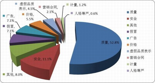 根据2011年上半年化妆品投诉数据分析,消费者对质量问题的投诉占总投诉量的一半以上,为52.8%,对化妆品安全问题的投诉占11.1%,对假冒伪劣问题的投诉占7.1%,对虚假品质表示问题的投诉占4.5%,对化妆品广告的投诉占7.1%,对价格投诉占5.5%,另外,还有一些对于销售合同、计量、以及人格尊严等问题的投诉。