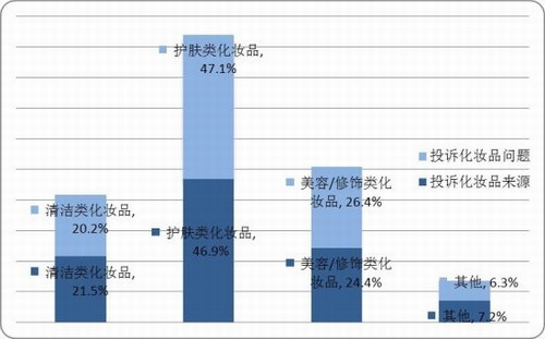 按照《化妆品分类》(GB/T1860-2002),常用化妆品分为清洁类化妆品、护理类化妆品、美容/修饰类化妆品。首先,不论从化妆品的投诉来源统计,还是从化妆品的投诉问题方面统计,护理类化妆品投诉占三类化妆品总投诉量的近50%。目前广大消费者对于皮肤的日常护理都非常重视,不仅是女士,男士也越来越关注自己皮肤的保养,投诉量大从另一方面看也说明护肤类化妆品的销售量也是非常可观的。因此,护肤类化妆品的安全更需要从生产和使用等全方位加以重视。其次是美容/修饰类化妆品问题投诉占26.4%;清洁类化妆品问题投诉占20.2%。