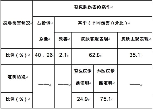 1、在有皮肤损害的案件中,消费者反映比较突出的是使用后有不良反应,但只有四分之一的消费者有医院的诊断证明。
