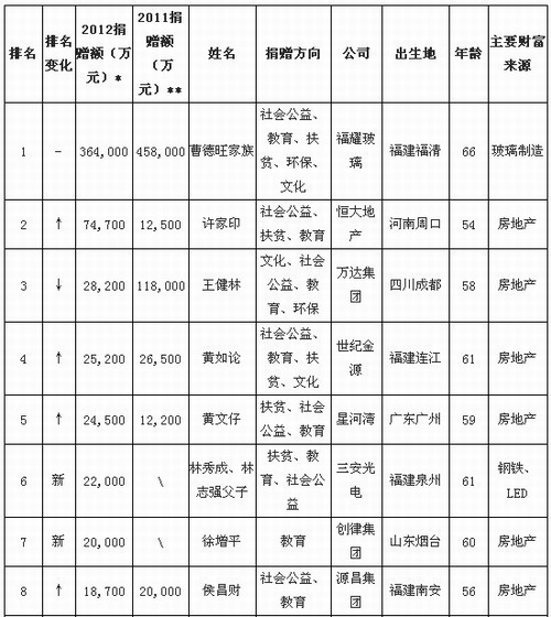 胡润研究院发布《2012胡润慈善榜》,这是胡润研究院连续第九年发布“胡润慈善榜”。《2012胡润慈善榜》以2011年1月1日至2012年3月31日的捐赠额为统计范围。民营企业家若控股公司50%以上,企业捐赠计入个人捐赠数额。以下为《2012胡润慈善榜》前百名榜单。