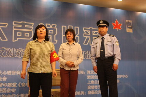 接着,根据红枫真实的案例改编的小品《家丑要外扬,暴力无处藏》上演,从导演到演员都是红枫的工作人员和志愿者。台上演员真情演绎的受暴妇女的悲惨处境和后来终于在社区干部和民警的帮助下,走向派出所报案,大声说出来的勇敢举动,引发了台下观众的强烈共鸣。观众不禁齐声高喊“家丑要外扬,暴力无处藏”,使会场气氛达到高潮。