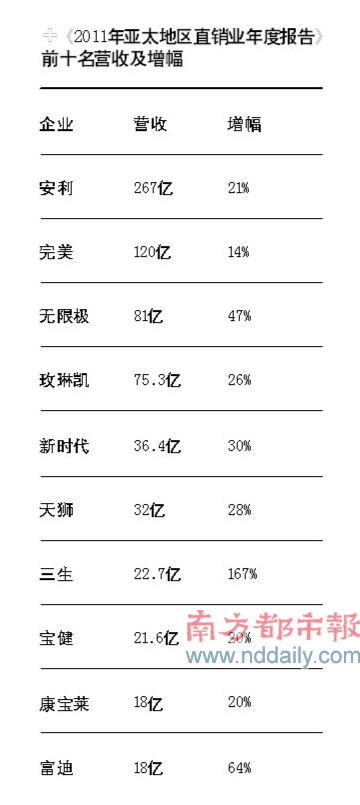 在2009年突破千亿大关,2010年达到1200亿规模之后,2011年的直销行业又取得17%的稳步增长,达到1400亿元。作为直销行业的年度重%要数据,上周末发布的《2011年亚太地区直销业年度报告》显示,安利、完美、无限极分别以267亿、120亿和81亿的营收位列冠亚季军。