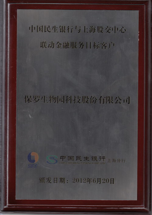2012年6月20日,中国民生银行上海分行与上海股权托管交易中心在民生银行大厦共同举办了向股交中心挂牌企业主动授信的仪式。保罗生物作为上海股交中心的首批挂牌企业应邀参加,财务总监顾恒先生代表企业出席了仪式。