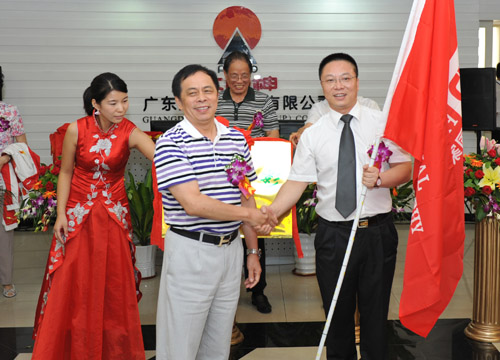 国家摄影协会领导戴兵向国家摄影协会东莞站副站长、行政总监周湘健授旗