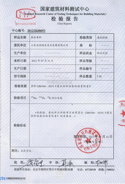 安然微元生化纺织品自上市以来,以显著的功效赢得了广大消费者的青睐。为树立品牌形象,帮助伙伴更好的开拓市场,安然公司近日委托国家建筑材料检测中心对安然纳米微元生化纺织品的原材料——纳米布料和纳米棉絮进行了放射性核素的检验。经检测,安然纳米布料和纳米棉絮的226Ra(镭—226)、232Th(钍-232)和40K(钾-40)的比活度完全符合国家相关要求,产品无放射性。