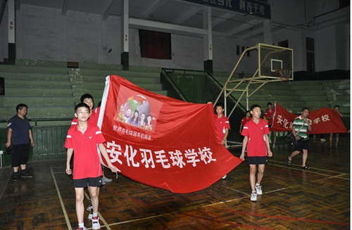安化羽毛球学校的队员为田卿摇旗呐喊
