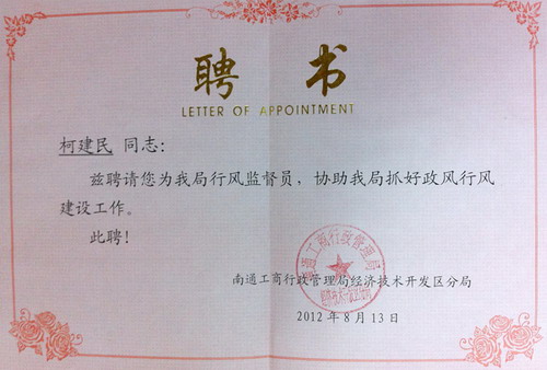8月13日,安惠公司副总经理柯建民参加南通工商局开发区分局行风监督员座谈会,受聘为该局行风监督员。据悉,行风监督员职责是参与和帮助工商局认真查找、整改机关作风和行风建设方面存在的问题,进而推进工商系统的行风建设不断推向深入。