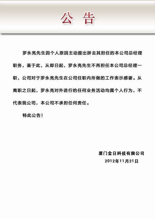 金日发公告 罗永亮因个人原因主动提出辞职