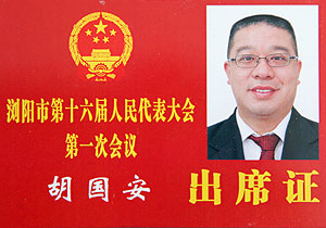 对胡国安董事长来说,人大代表,是一种荣誉,更是责任,既是动力,更是担当。在他担任浏阳市第十五届人大代表期间,充分履行人大代表的职责,反应百姓心声,积极响应市委、市政府的号召,献计献策,关注民生,为浏阳的经济繁荣、社会发展、民主建设等事业不遗余力,荣获浏阳市第十五届“优秀人大代表”称号。