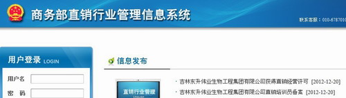 编者按:商务部在2012年6月8日发布了吉林东升伟业生物工程集团有限公司申请直销声明。三次申牌,六载努力,东升伟业终于在8月28日获得国家商务部颁发的直销经营牌照。10月13日,东升伟业举行第32张直销牌照揭牌仪式。12月20日,商务部直销行业管理信息网站正式公布了这一信息。此次获批直销区域包括吉林省7个地市、25个区,直销产品为1款保健食品,此外,20日还有5名直销培训员备案。以下是详细信息: