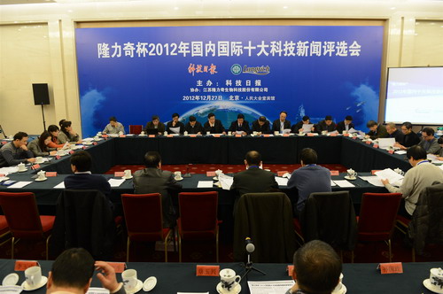 由科技日报社主办、隆力奇生物科技股份公司协办,部分两院院士、中央主流新闻媒体负责人、科技宣传部门负责人、资深科技记者和新闻网站主编共同评选出的2012年国内国际十大科技新闻今天在北京揭晓。