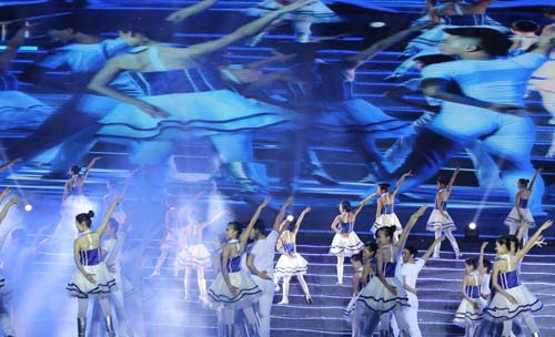 追光灯聚焦在炫丽的舞台,极具河南地域文化特色的少儿豫剧舞蹈《粉墨》、《少林武术》……还有激情动感的《我们就是太阳》等精彩节目的陆续上演,串联着整个盛会的高潮。郑州国际会展中心的夜空,在歌声与曼舞中变得更加魅力迷人,在全体太阳神人发起冲锋的号角声中,变得更加宽广辽阔。