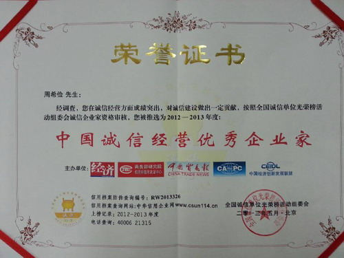 周希俭获“中国诚信经营优秀企业家”称号