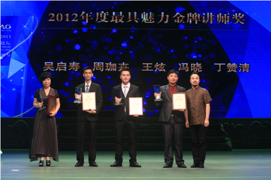 颁奖盛典晚会第二十个奖项是2012年度最具魅力金牌讲师奖的获得者是:吴启寿、周伽卉、王炫、冯晓、丁赞清