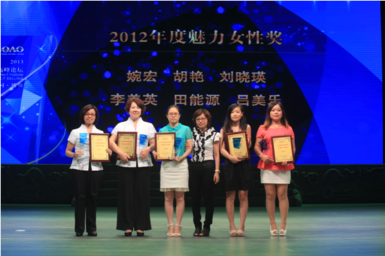颁奖盛典晚会第二十二个奖项是2012年度魅力女性奖的获得者是:婉宏、胡艳、刘晓瑛李美英、田能源、吕美乐