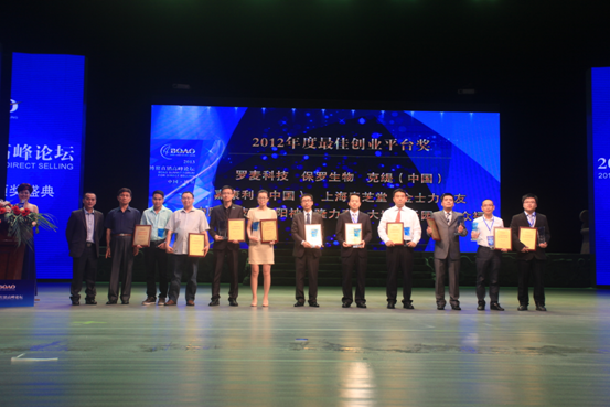 颁奖盛典晚会第一轮第一个奖项是2012年度最佳创业平台奖,那么获得这些奖项的企业有:罗麦科技、保罗生物、克缇(中国)、嘉康利(中国)、上海春之堂,金士力佳友、中脉科技、太阳神、隆力奇、大地智乐园、淘众福