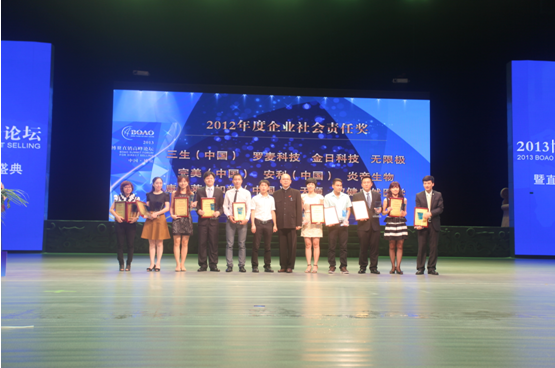 颁奖盛典晚会第二个奖项是2012年度企业社会责任奖的企业有:三生(中国)、罗麦科技、金日科技、无限极、完美(中国)、安利(中国)、炎帝生物、康宝莱、如新(中国)、天狮、权健自然医学