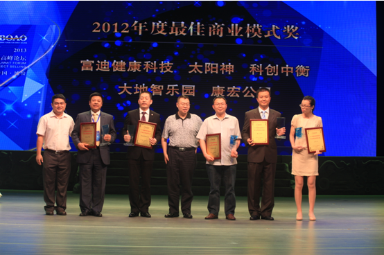 颁奖盛典晚会第三个奖项是2012年度最佳商业模式奖的企业有:富迪健康科技、太阳神、科创中衡、大地智乐园、康宏公司