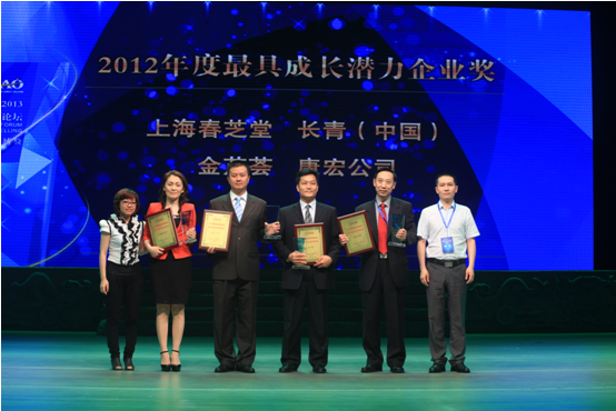 颁奖盛典晚会第六个奖项是2012年度最具成长潜力奖的企业有:上海春之堂、长青(中国)、金芦荟、康宏公司