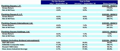 Ackman的Pershing Square在三季度致投资者的信中披露的业绩显示,三季度Pershing Square扣除费用后净亏损5.4%,这使得本年度至今的收益率收窄至0.5%。