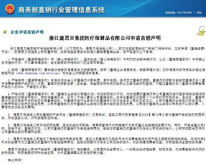 浙江康恩贝集团医疗保健品有限公司申请直销声明