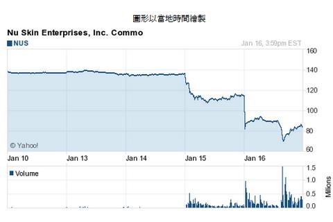 美国直销业巨头如新连续两日遭大陆《人民日报》猛烈炮轰〝组织聚会、洗脑、涉嫌传销〞,中国商务部16日更表明已经对如新的传销手法展开调查,导致如新股价狂跌,创下9年多来最大跌幅,纽约股价暴跌26%,收在84.80美元(约合人民币513.14元),那斯达克股价下跌38.55%,收在70.81美元(约合人民币428.48元)。