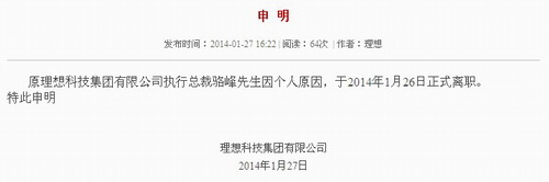 1月26日, 理想科技官方宣布骆峰因个人原因离职。骆峰2013年12月加盟理想科技,任公司执行总裁。