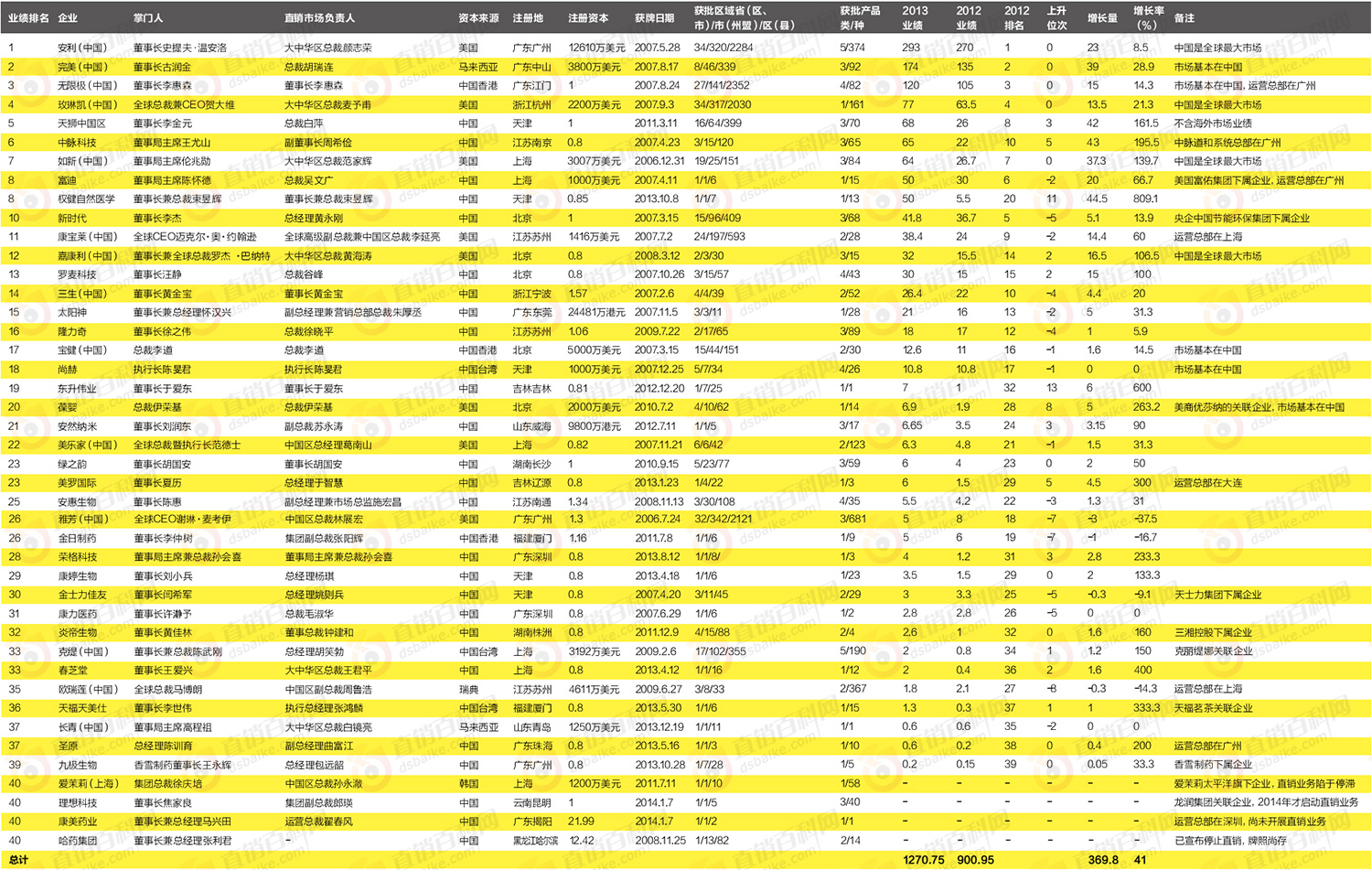直销基本面截至2014年1月7日,我国共拥有43家正式获得直销经营许可证的企业,其中有39家企业已经开展直销业务,他们在2013年创造了总计1270.75亿元的业绩,比2012年的900.95亿元净增369.8亿元,增长率高达41%,是有统计以来中国直销行业业绩增长最快速的一年。这39家直销企业的平均业绩为32.58亿元,相对于2012年的23.1亿元上涨9.48亿元,涨幅惊人。