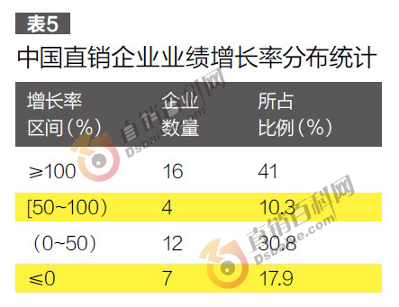如果用增长率来看,中国直销企业这一年的表现就更为瞩目。有16家企业的业绩增长率超过100%,占所有已启动市场企业的41%,另有4家企业实现了50%~100%的增长,12家企业实现50%以下的业绩增长。(参见表5)