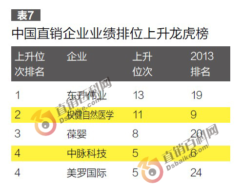 在以上情况的拉动下,直销企业的排位也发生了明显变化。因获牌的利好拉动,东升伟业的业绩排名直升13位到了第19位,权健暴升11位到了第9位,葆婴也净增8位升至第20位,中脉和美罗国际则上涨5位,双双进入上升位数最多的企业行列。(参见表7)