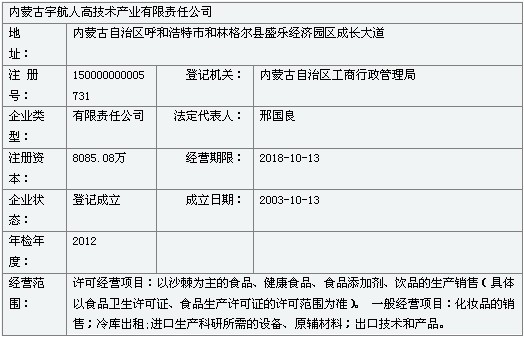 2005年宇航人公司进入内蒙古自治区工业百强企业;2006年被认定为内蒙古自治区10强高新技术企业;2009年“宇航人”被国家工商总局认定为中国驰名商标;2010年被认定为国家农业产业化重点龙头企业;2011年,由于宇航人公司在沙产业方面的巨大贡献,宇航人公司获得中国林业产业突出贡献奖,内蒙古发展沙产业突出贡献奖。