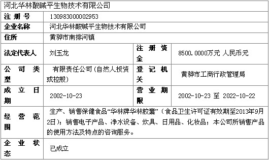 河北华林酸碱平生物技术有限公司,是河北华林集团旗下的全资子公司,是一家专业研制、生产、销售功能型健康食品的实体企业。华林酸碱平生物技术有限公司成立于2003年,至今已累积投资一亿元人民币,建成占地32000平方米的国际GMP等级标准生产基地,同时投入巨资建成了万亩碱性紫花苜蓿种植园,以确保高品质原材料的供应,满足企业可持续发展的战略需要。公司拥有自己的技术研究所和专家课题组,权威专家及科学工程技术人员148人,并成立了以天津南开大学生物化学与分子生物学李建民教授为所长的、全球首家专门研究人类酸碱平衡的研究所---北京华林维尔酸碱平衡生物技术研究所。其研发生产的酸碱平系列产品大力倡导中华民族的食疗文化,专门纠正人体酸性体质,保障人体健康,造福全人类。这一国内首创、国际领先的产品,得到国务院副总理回良玉的高度评价,有关专家和政府有关部门正在向全社会推广,产品上市后已经受到广大消费者的青睐。