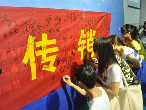 学生代表在“校园拒绝传销”横幅上签名