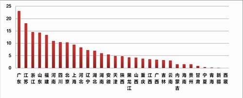 从直销员数量看,直销员人数低于1000人的企业有23家,超过10万人的企业有4家,4家企业直销员人数合计192.41万人,占直销员总数的93.57%。其中,人数最多的企业有直销员118.71万人,占全行业的57.73%。按地区划分,直销员人数最多的地区是广东,直销员有23.45万人,占全国的11.4%,江苏其次,直销员有14.19万人。