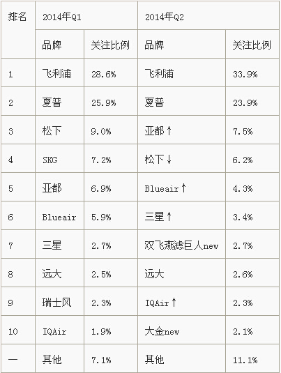 表 2014年Q1-Q2中国空气净化器市场品牌关注比例对比