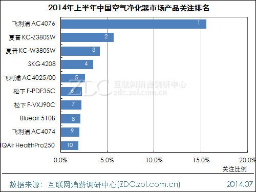 (图) 2014年上半年中国空气净化器市场产品关注排名