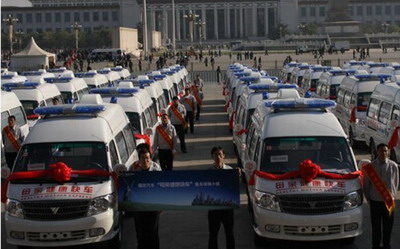 基金启动仪式结束后,在大会堂东门外广场举行了“母亲健康快车”发车仪式。50辆满载着爱心的“母亲健康快车”将分别奔赴40多个县级医院,开展多种形式的妇女健康服务。