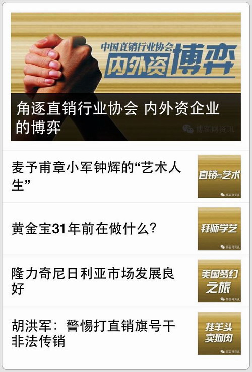 汇聚中国直销行业声音,直销博客网近期推出了“博客网资讯”微信,欢迎各位网友关注。您只需要打开微信,在朋友→添加朋友→查找微信公众号→输入“博客网资讯”或“dsblognet”,查找→点击关注就OK了。把握行业风向,只需用您的手机扫一扫,博客网资讯将为您提供最有价值的讯息。