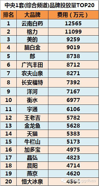 中央一套三季度广告投放(刊例)TOP20