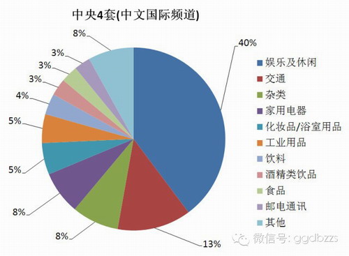 其中娱乐及休闲、交通、家用电器品牌投放占据前三甲,分别占据40%、13%、8%。