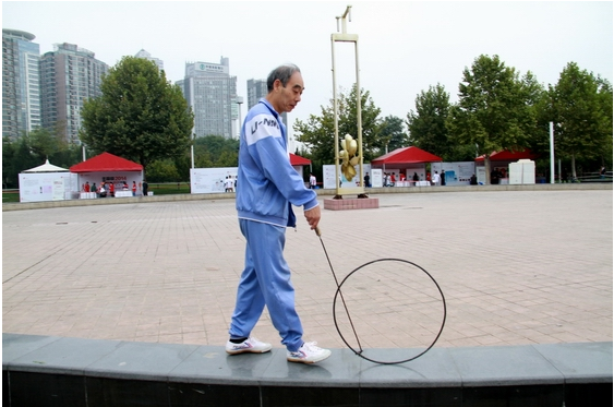 郑州本地的马大爷是个健身爱好者,每逢行走日、市民马拉松这样的运动盛事,都会带上自己心爱的铁环一起行走。马大爷介绍,铁环是中国民间传统的健身用具,现在已经不多见了,这副铁环是他自己费大力气用桶箍自制的,每天都要带出来“遛”两圈。在行走现场,只见他时而推着铁环轻盈行走,时而让铁环滚在两腿中间,时而带着铁环上下台阶……“人有惰性,走多了就会觉得无聊懒得走,但带上铁环,你自然而然就会多走路,对健康很有益处。滚着这铁环啊,我好像又回到了童年!”