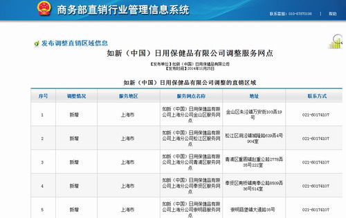 25日,商务部直销行业管理信息系统发布如新(中国)日用保健品有限公司调整直销区域信息,新增了上海市金山区、松江区、青浦区、奉贤区、崇明县共5个服务网点。具体如下: