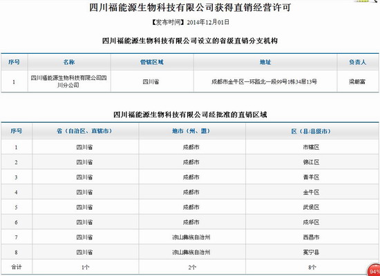 2014年12月1日,商务部直销行业管理信息系统公布了四川福能源生物科技有限公司获得直销牌照的消息,截至到目前,商务部网站上公布的获牌直企的数量升至47家。