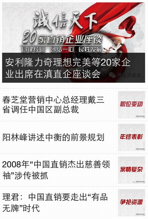 汇聚中国直销行业声音,直销博客网近期推出了“博客网资讯”微信,欢迎各位网友关注。您只需要打开微信,在朋友→添加朋友→查找微信公众号→输入“博客网资讯”或“dsblognet”,查找→点击关注就OK了。把握行业风向,只需用您的手机扫一扫,博客网资讯将为您提供最有价值的讯息。