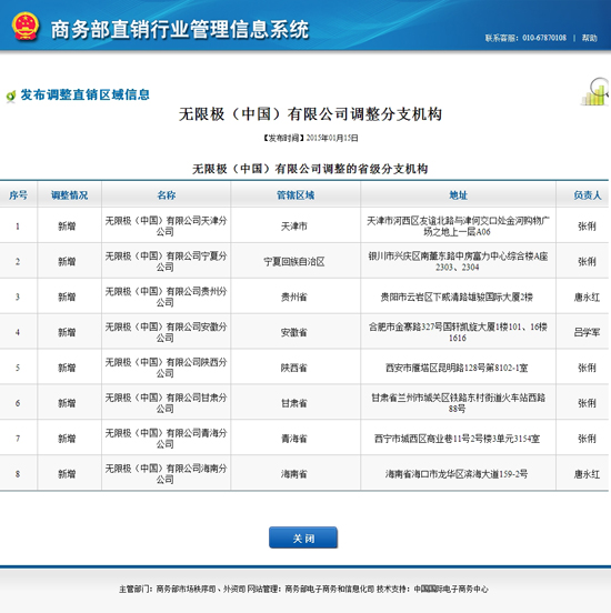 2015年1月15、16日,商务部直销行业管理信息系统网站发布了无限极(中国)有限公司调整的直销区域的信息。此次新增了天津市、宁夏回族自治区、贵州省、安徽省、陕西省、甘肃省、青海省、海南省8个省市,共计359个网点。