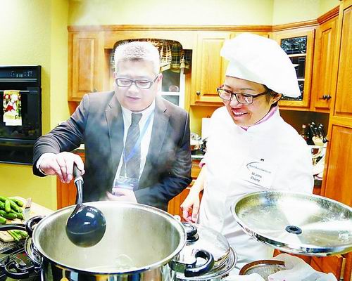 在签约仪式前,RegalWare公司向嘉宾们现场烹饪,展示其厨具的“神奇”特性:不用油即可以煎鸡蛋、肉排、海鲜和蔬菜类料理,还没有熟的米饭关火以后闷在锅中不到10分钟就可以煮成一锅熟饭。