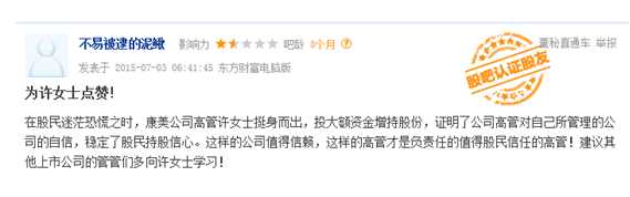 在股民迷茫恐慌之时,康美公司高管许女士挺身而出,投大额资金增持股份,证明了公司高管对自己所管理的公司的自信,稳定了股民持股信心。这样的公司值得信赖,这样的高管才是负责任的值得股民信任的高管!在当下的这种环境下,我们需要更多康美药业、许冬谨这样的女士共同承担起企业责任,和广告股民一起共赴难关,体现企业价值!