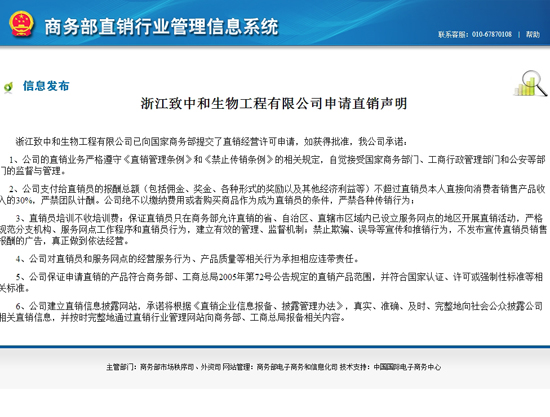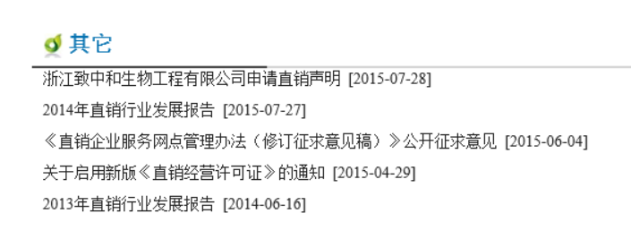 7月28日,商务部直销行业管理信息系统信息发布浙江致中和生物工程有限公司申请直销声明,不过此次公示有别于其他企业,并未直接出现在“企业申请直销声明”一栏中,而是独辟蹊径的在“其他”一栏。