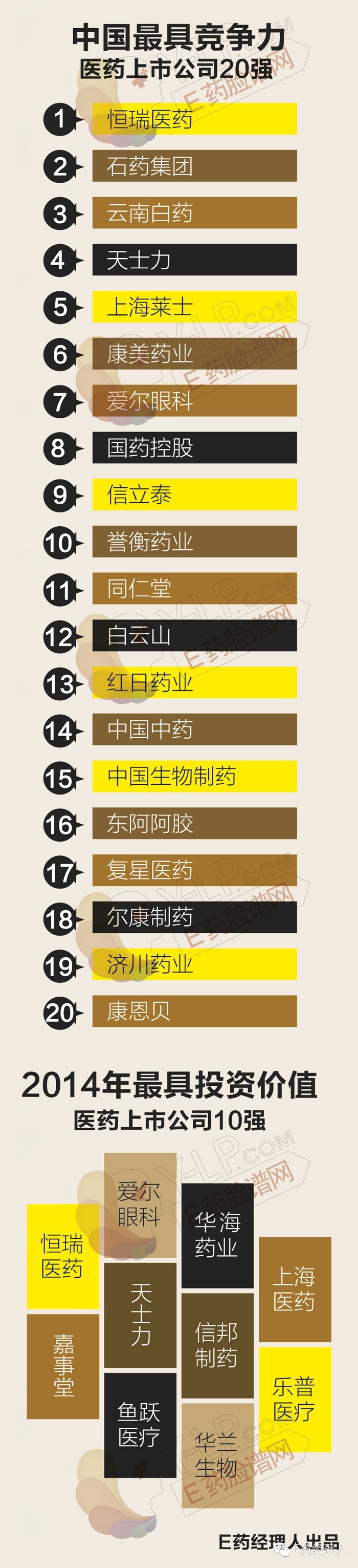 由中国医药企业管理协会主办,E药经理人杂志社与和君咨询集团承办的“第七届中国最具竞争力医药上市公司20强评选暨2015年度最具投资价值医药上市公司10强评选”日前揭晓,恒瑞医药、石药集团、云南白药、天士力继续坐稳竞争力20强第一军团,上海莱士、誉衡药业、中国中药等首次杀入20强行列。